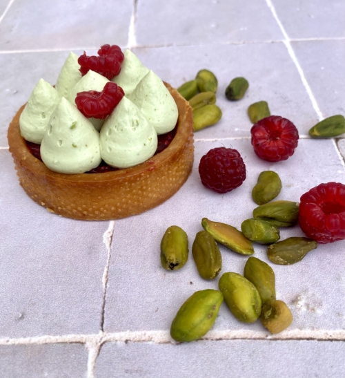 ![]()  | Tartelette framboise pistache Tartelette framboise pistache diamètre 7cm En savoir plus Pâte sucrée Crème de pistache Compotée de framboise Ganache montée à la pistache Risques allergènes: fruits à coque, gluten, lactose