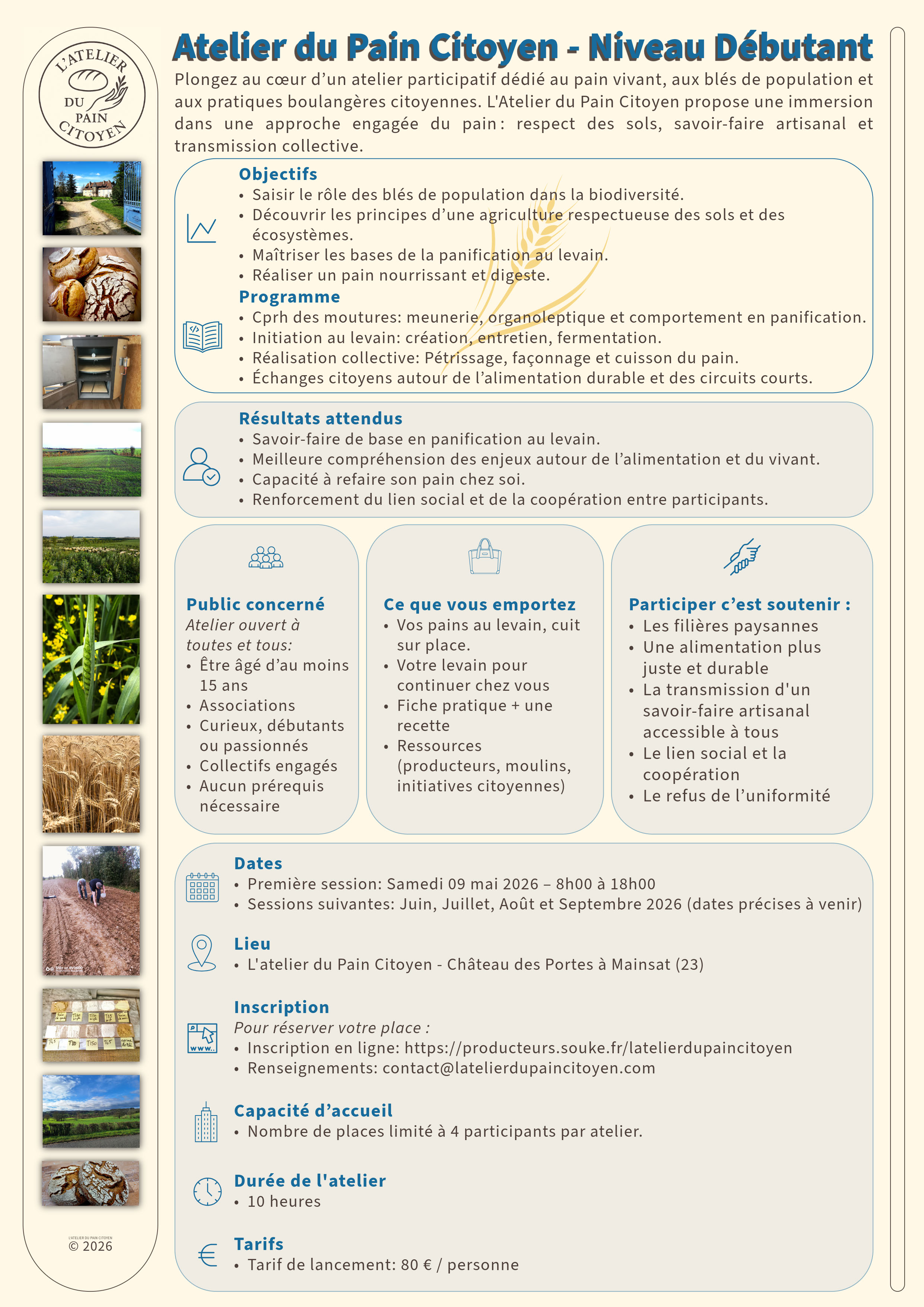 Une occasion unique de vivre une expérience artisanale authentique, de découvrir le travail du blé de population et d’apprendre les bases du pain au levain dans un cadre chaleureux.