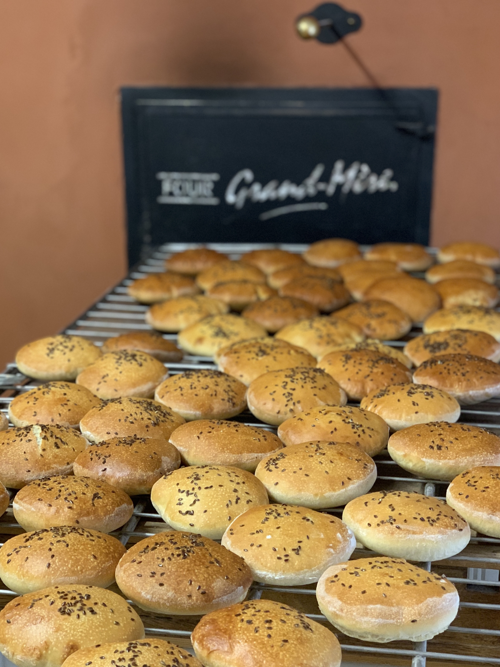| Burger Pain burger tout moelleux grâce au yudané (juste de la farine et de l’eau bouillante) au levain avec une pointe de levure, le tout saupoudré de quelques graine pour relever le goût | 100 g | 1.00 € la pièce |