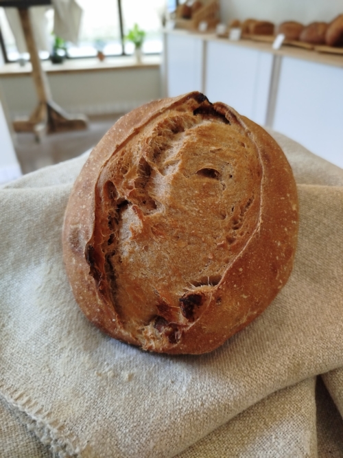 ![]() | La Meule En savoir plus Un pain rustique de bonne satiété, à partir de farines paysannes locales bio de blé T80/T110 moulues sur meule de pierre, et levain dur de blé. Des notes légèrement maltées, une mie dorée douce et tendre. | 850 g | 4.50 € la pièce |