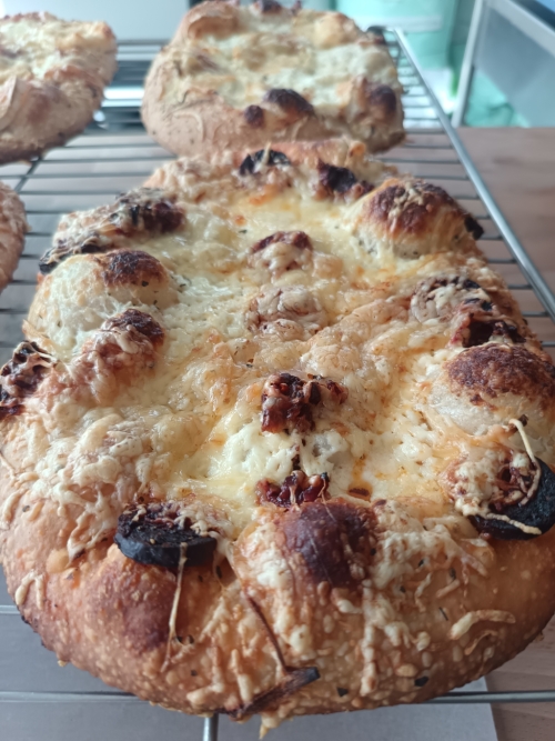 ![]() | Fougasse chorizo tomates confites Farine de blé T65*, levain de blé T65*, lait*, eau filtrée, huile d'olive, chorizo, tomates confites, oignons, fromage rapé*, crème fraîche*, basilic, sel. En savoir plus *allergènes 1 fois par mois | 500 g | 6.00 € la pièce |