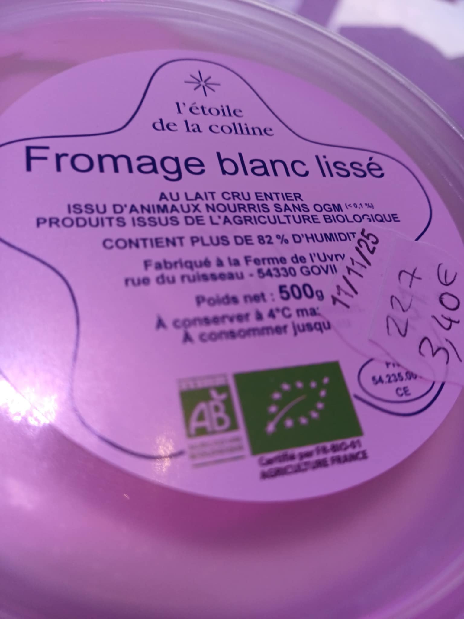 ![]()  | Fromage blanc lissé bio, 500g Ferme l'étoile de la colline, Goviller  | 3.40 € la pièce  |