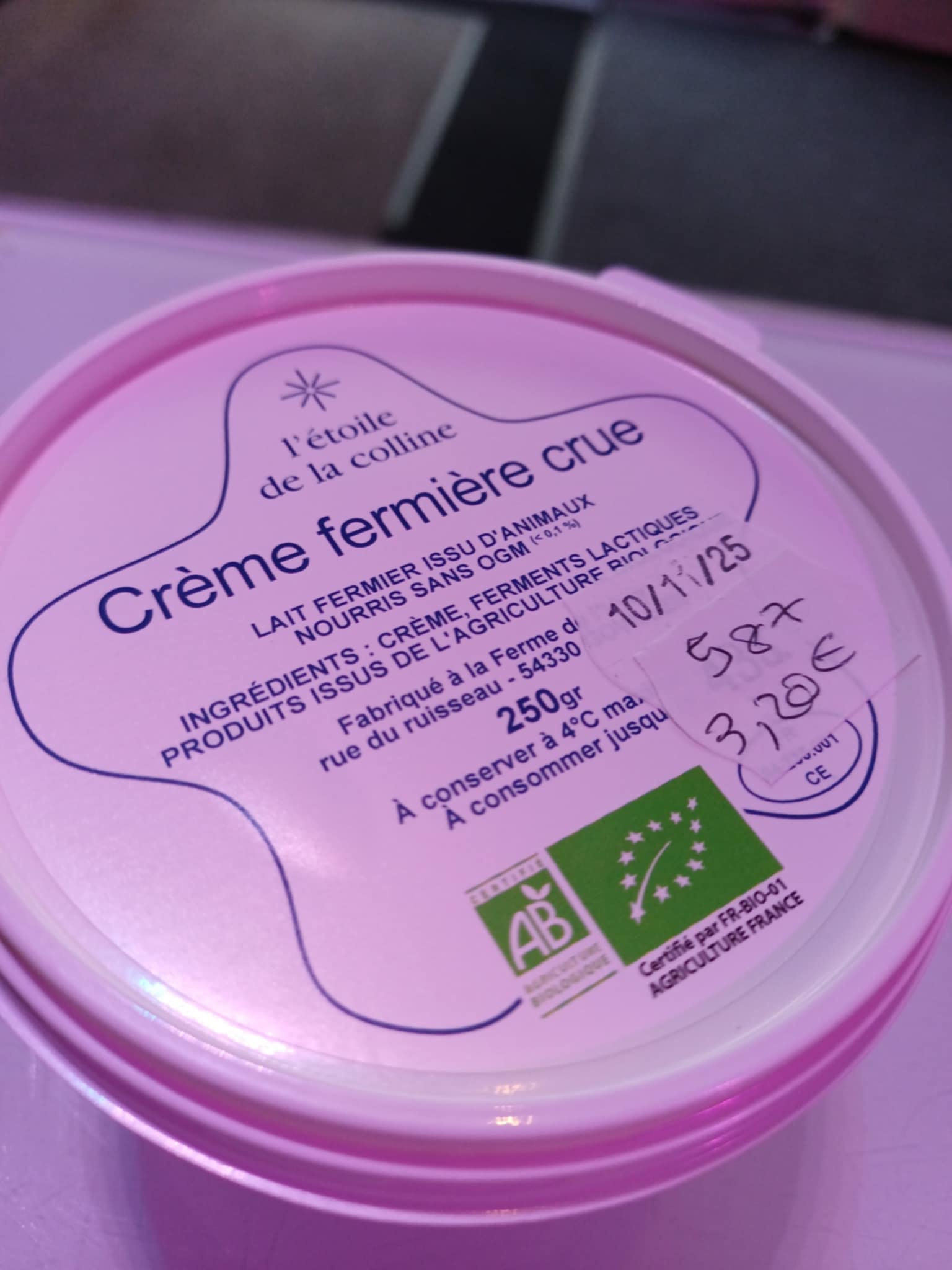 ![]()  | Crème fermière crue, bio, 250 g Ferme l'étoile de la colline, Goviller  | 3.20 € la pièce  |