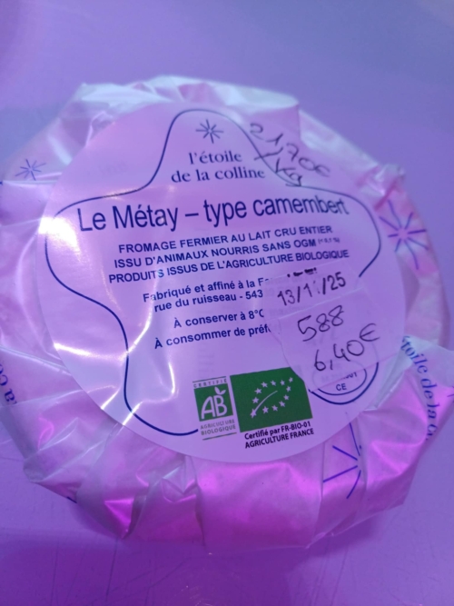 ![]()  | Le Métay, bio, style camembert, 21,70 €/kg Environ 300 g, Ferme l'étoile de la colline, Goviller  | 21.70 € le kg  |