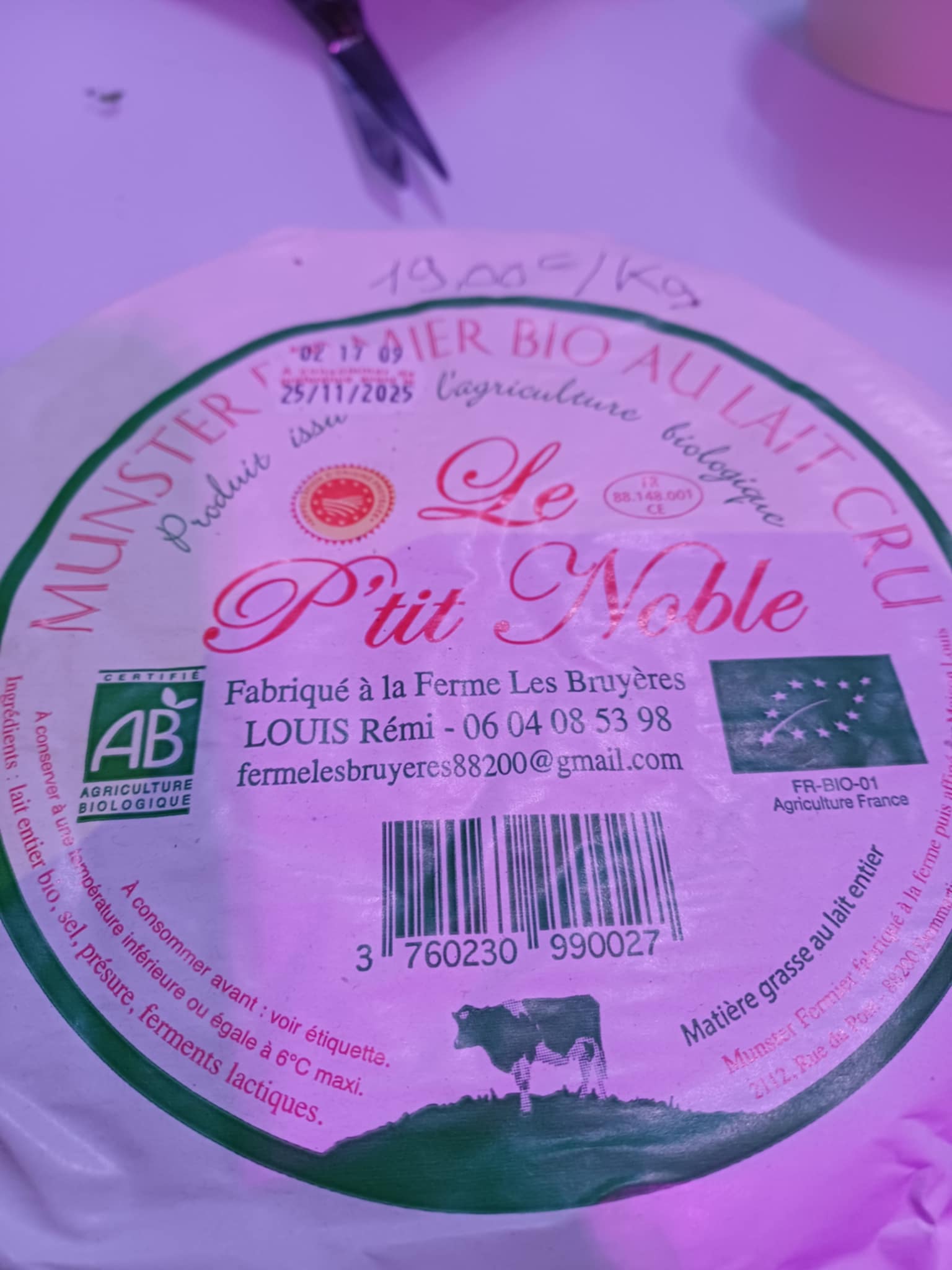 ![]()  | Munster au lait cru, bio, 19€/kg Ferme les Bruyères, 88200 - coupé en 1/8, en 1/4, ou entier(1kg)  | 19.00 € le kg  |