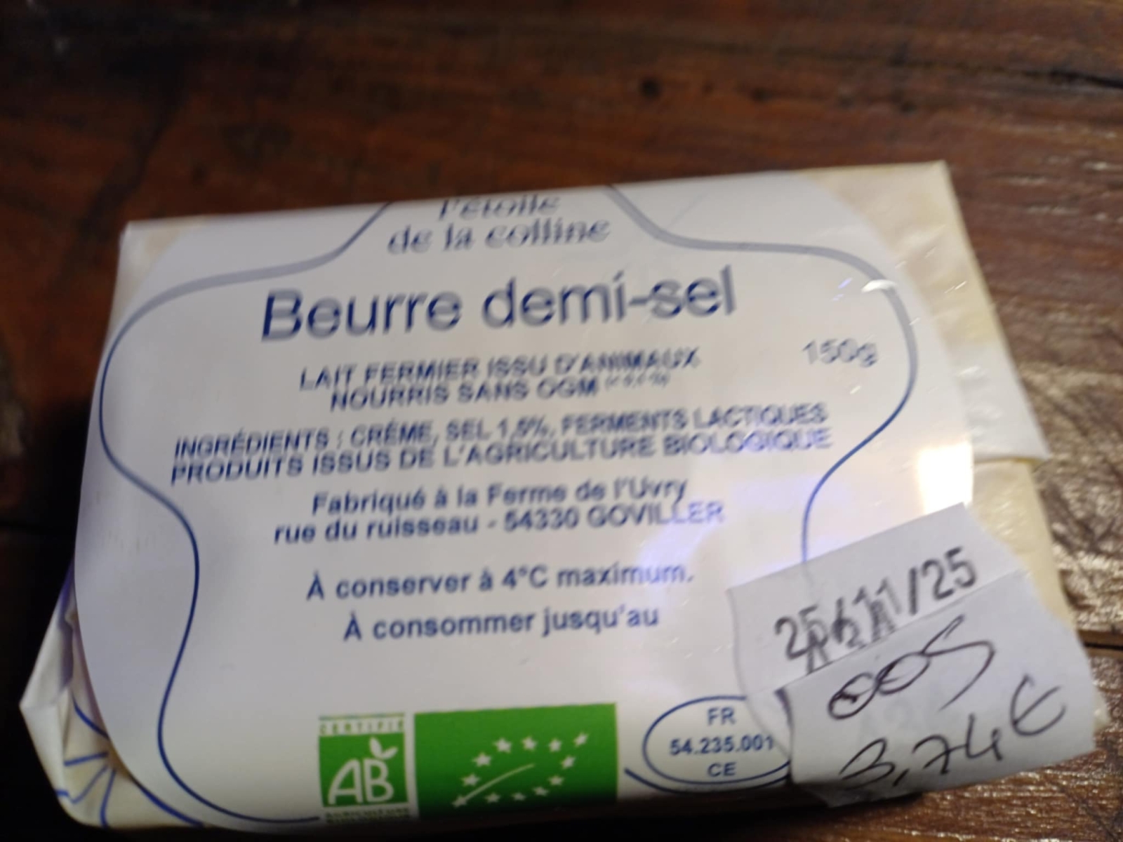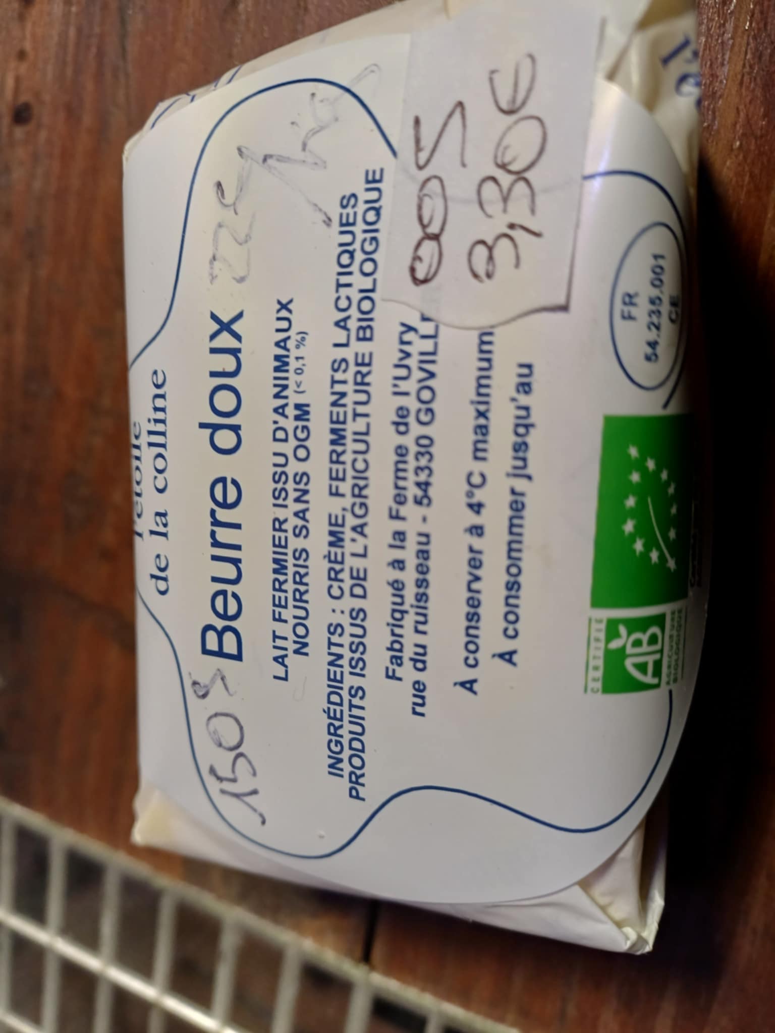 ![]()  | Beurre doux fermier, bio, 22,00 €/kg Plaquette d'environ 150 g, Ferme l'étoile de la colline, Goviller  | 22.00 € le kg  |