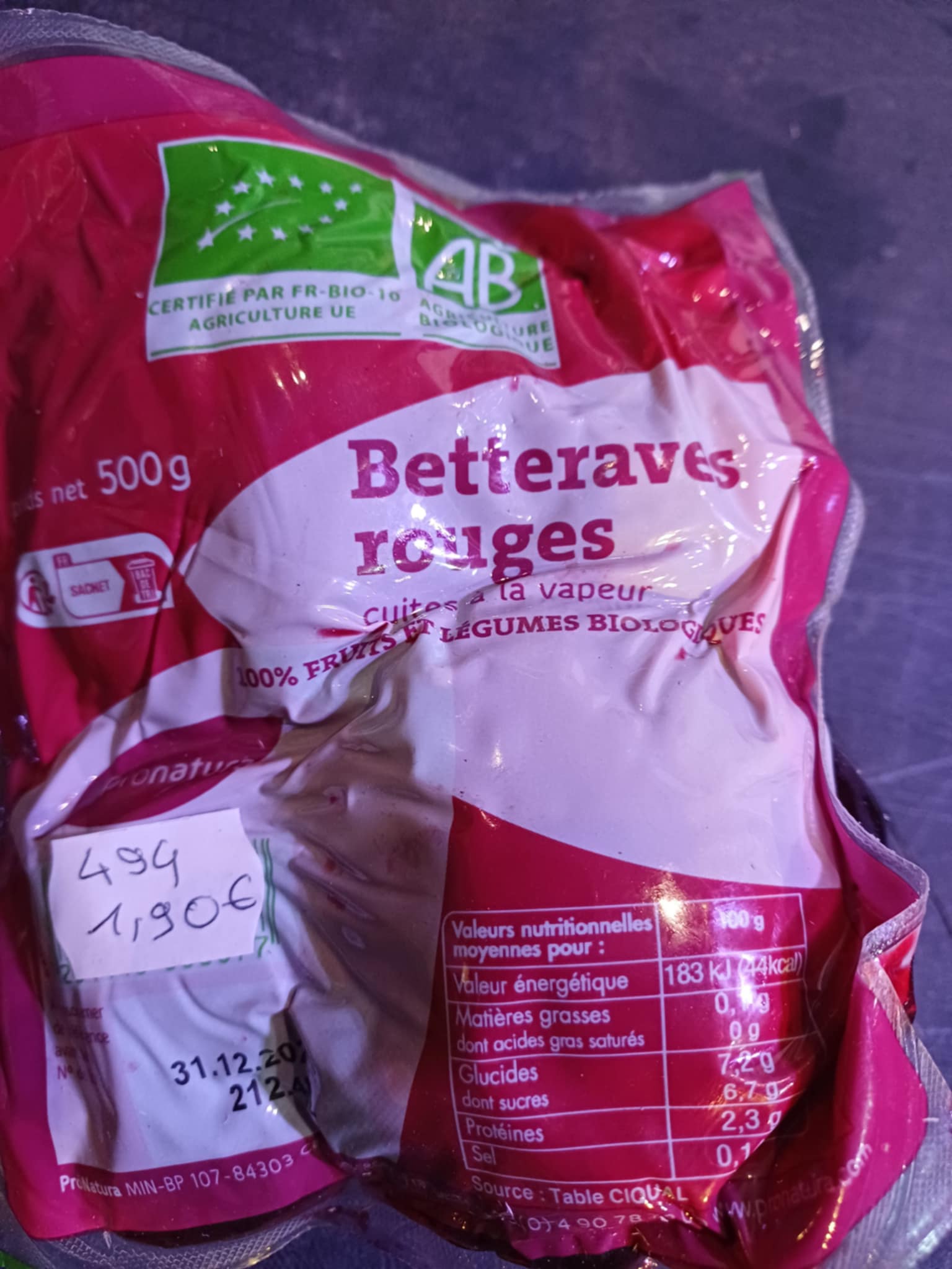![]()  | Betteraves bios, sachet de 500g  | 2.80 € la pièce  |