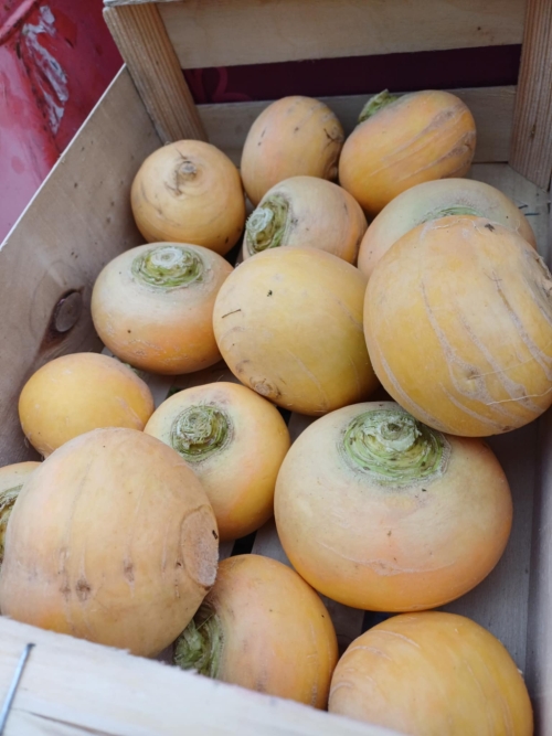 ![]()  | Navets "boule d'or" bio,  (3,50€/kg) Plus sucré que le navet classique. Un top ventes  | 3.50 € le kg  |
